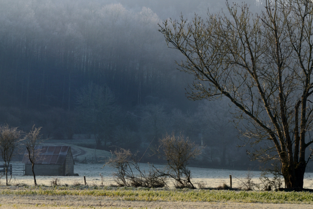juste comme le soleil commence à sortir de la brume derrière la colline, et les arbres
