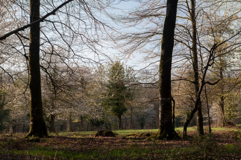 Le printemps est « là », jaillissant, foisonnant, éclatant comme un feu d’artifice en cet après midi, quelque part dans une forêt, sur les branches des cerisiers qui remplissent une clairière que je savais trouver « là ». « Là » c’est vite dit parce que cette clairière n’est sur aucune carte, ni IGN, ni OpenStreetMap ! Sans doute, sautant par dessus le ruisseau bien à l’écart du chemin d’exploitation, suis-je passé dans un autre univers, tout semblable au nôtre, sinon que dans une clairière remplie d’arbres en fleurs on n’entend pas chanter les oiseaux, ni ne voit-on voler les insectes pollinisateurs qui s’activent dans le nôtre….